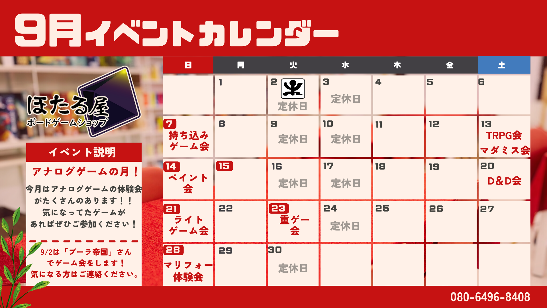 9月予定表 【9月予定表】 今月はいろんなアナログゲームの体験会がたくさんあります!! TRPGはクトゥルフやゆうやけこやけ、ミニチュアゲーム はマリフォーやウォーハンマーが開催予定です! 気になるゲームがありましたら、ご連絡ください!!